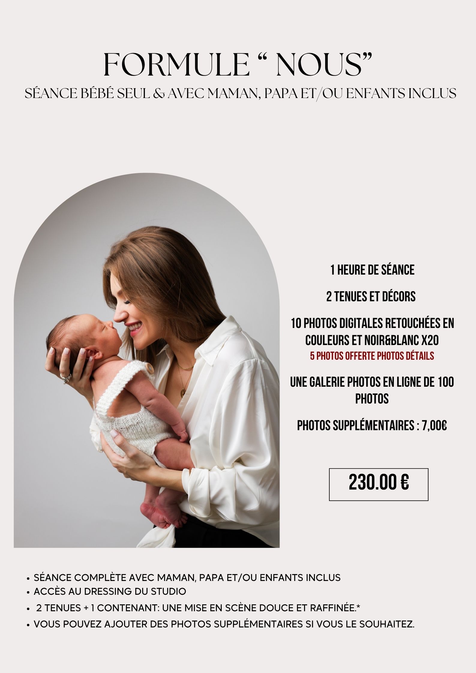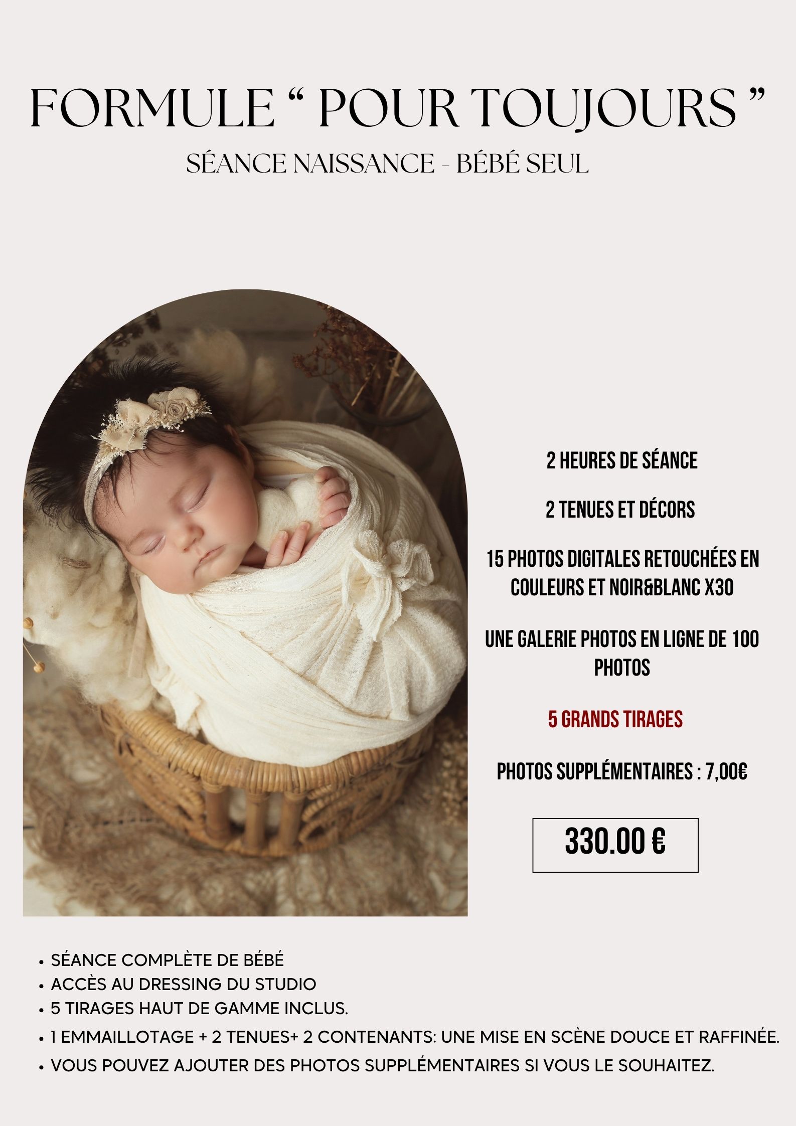 Toutefois si vous n’aviez pas pu réserver votre séance durant la grossesse, il est possible de me contacter dans les premiers jours de votre enfant et nous fixerons le rendez-vous ensemble dans les 6 semaines de bébé.