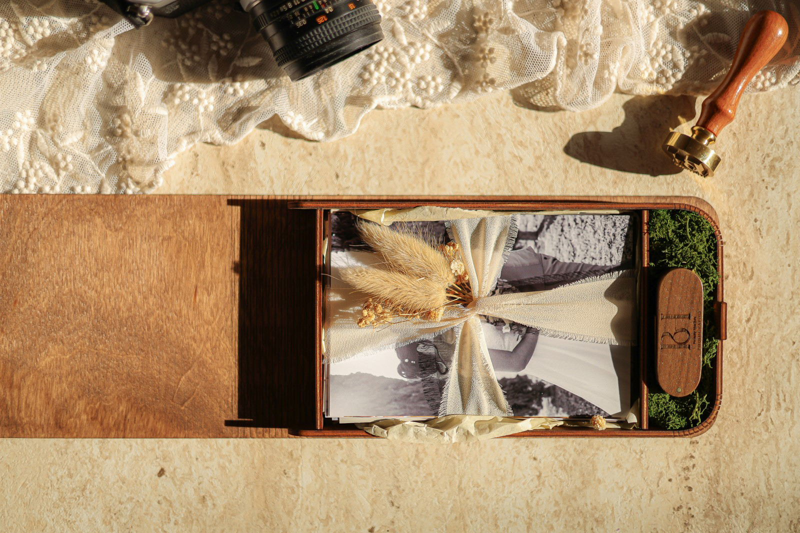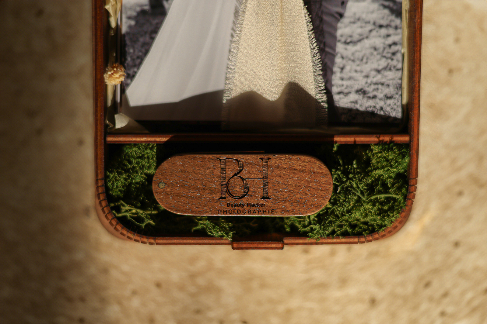 A l’interieur de celui-ci, vous trouverez une cléz USB en bois. A l’intérieur de la clé vous trouverez les photographies de votre mariage. Dans le deuxième compartiement de votre coffret photo de mariage, vous découvrirez une séléction d’une dizaines de photos imprimées.